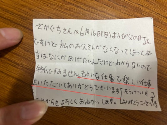 みらい工房のご利用者様から、担当の坂口さんに実際に届いた手紙。「きれいな仕事で楽しい仕事をいただいてありがとうございます。これからもよろしくおねがいします」と記載されている。