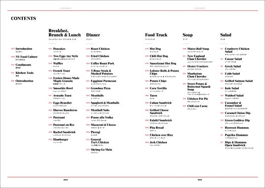 はじめに/NYの食文化/調味料/道具/ブレックファースト、ブランチ & ランチ/ディナー/フードトラック/スープ/サラダ/ブレッド/ベイクドトリーツ/トリーツ/ドリンク/アぺタイザー&アルコール/ストックとソース/保存食/おわりに