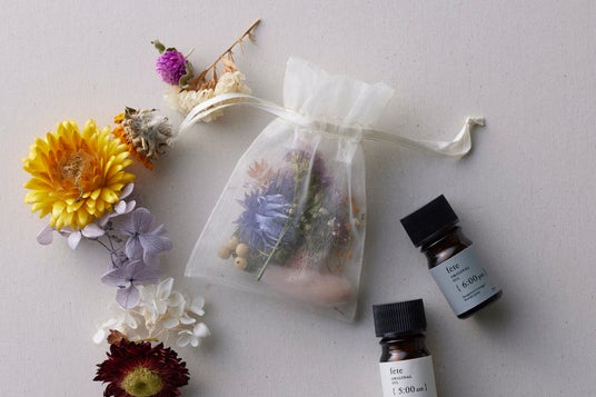 まずは10種類以上のドライフラワーから、お好きなものを選んでオーガンジーの袋に詰めていただきます。さらに下着の製造過程で発生してしまう残材料のアップリケを一緒に詰めて飾り付けし、仕上げにアロマオイルを垂らして完成です。
