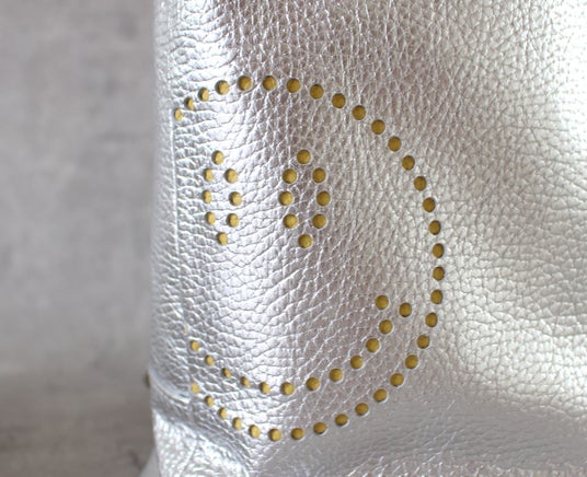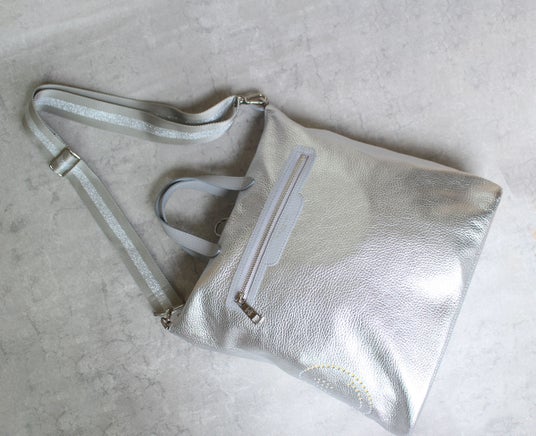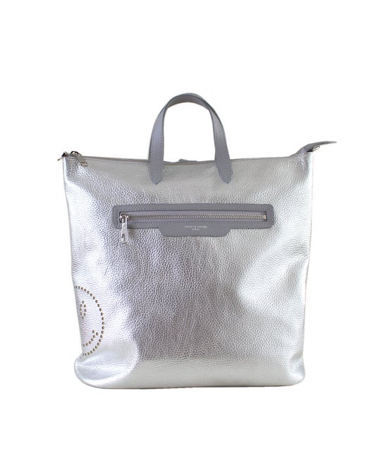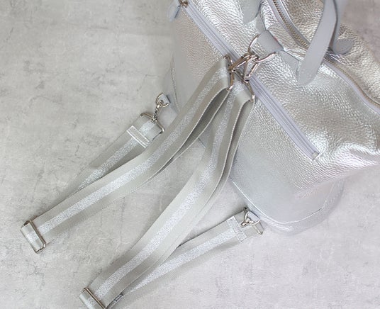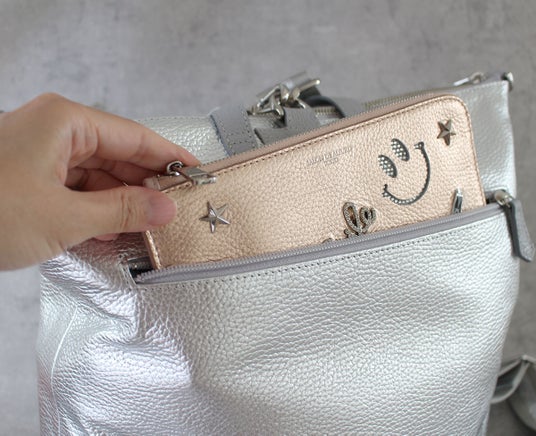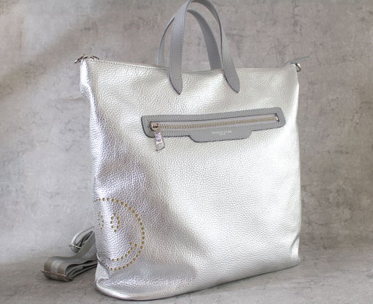 煌めくシルバーカラーのボディにスマイルマークを配した明るいデザインが特徴。イタリア製レザーを使用しながらも約500g(ショルダー2本装着時のリュックサック時は約700g)と非常に軽くしなやかに仕上がっています。