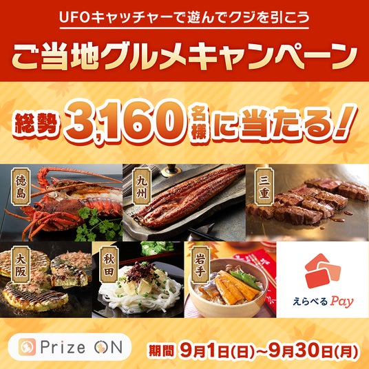 株式会社セガ フェイブは、UFOキャッチャー(R)をおトクに遊べるアプリ『Prize ON(プライズ オン)』において、2024年9月1日(日)より『その場で当たる!Prize ON限定 ご当地グルメキャンペーン』を実施いたします。