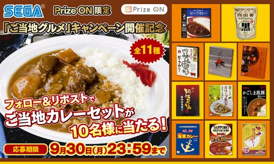 『Prize ON限定 ご当地グルメキャンペーン』の開催を記念し、9月1日(日)より、Prize ON公式アカウント( https://twitter.com/PrizeON1201 )をフォローし、対象の投稿をリポストいただくと『ご当地カレーセット(全11種)』が抽選で10名様に当たるフォロー&リポストキャンペーンを開催いたします。
