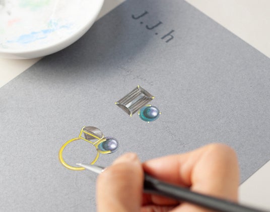 「J.J.h」のサステナブルジュエリーは新たな鉱山採掘を必要としないリサイクルされた素材が特徴です。デザイナーは1つの宝石を時間をかけて丁寧に観察し、1点1点、シェイプやカラーなど宝石の持つ個性からインスピレーションを得て、その宝石にとって最適なデザインを起こします。小さな傷やカケもその宝石が持つヒストリーのひとつと捉え、その個性にあったデザインをほどこし、世の中に一つしかないジュエリーを販売します。