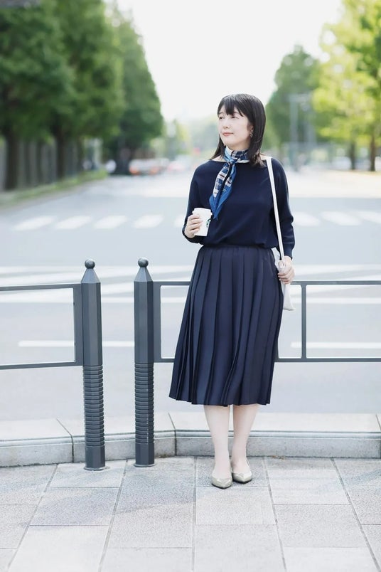 上下ネイビー合わせのシンプルコーデのワンポイントに取り入れたスカーフ。菱形のためコンパクトに巻いてもボリュームが出過ぎず、ラフな印象になりがちなドルマンスリーブニットにも、簡単に品がプラスできます。プリーツスカートは、片ひだのプリーツで変化の効いたデザイン。休日のおでかけ~オフィススタイルにもマッチするネイビースタイルです。