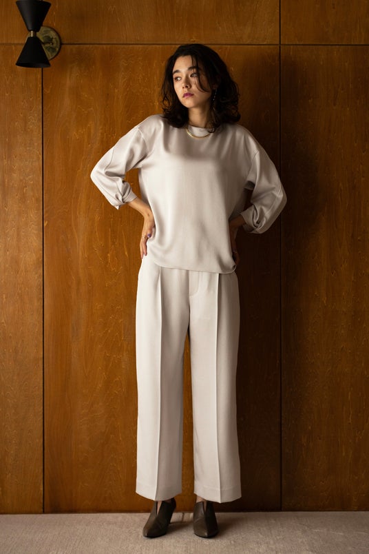 ふわっとした柔らかな風合いのとろみ感や、さりげない光沢感があるビンテージサテンを使用したブラウス、ジレジャケット、キャミワンピース、ジョグパンツ、ワイドパンツなどの計5型をラインナップ。