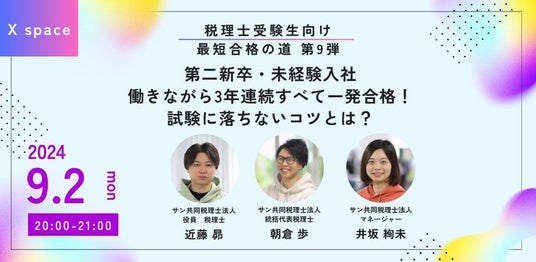 サン共同税理士法人(本社:東京都港区、代表社員: 朝倉 歩)は、 2024年9月2日(月)20時より「税理士試験 最短合格の道」と題し、最短で試験に合格する勉強方法やモチベーション維持方法などをX(旧Twitter)スペースにてお伝えいたします。今回は、採用担当役員 近藤昴(税理士)と現在税理士受験をしているマネージャー井坂 絢未とともに、働きながら税理士試験に合格するポイントをお伝えします。