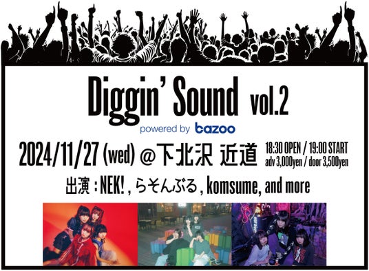 「Diggin’ Sound」は、「楽天ブックス」とPCI MUSICが共同で開催する音楽ライブイベントで、本年6月19日(水)に第1回となる「Diggin’ Sound vol.1」を開催し、好評を博しました。第2弾として、「Diggin’ Sound vol.2」を11月27日(水)にライブハウス「下北沢 近道」にて開催します。本イベントには、NEK!、らそんぶる、komsumeの出演が決定しており、追加アーティストについても今後発表される予定です。