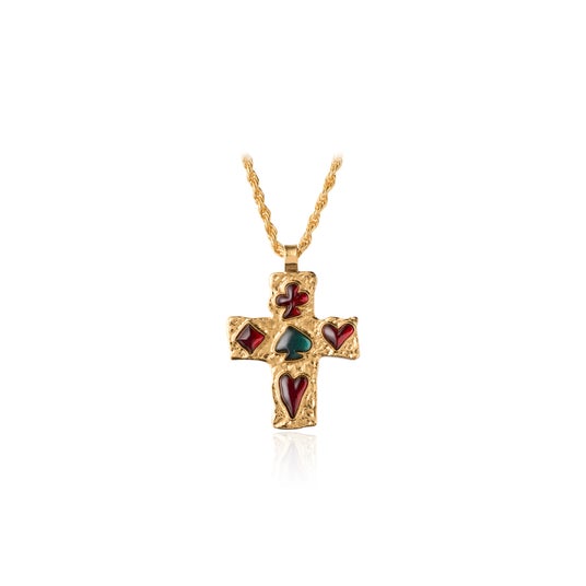 (ハート)、♤、♧、♢の各モチーフとゴールドカラーがマッチした大振りなデザインが魅力的の、ねんどで模ったようなクロスのネックレス。