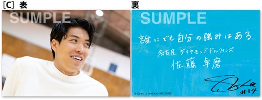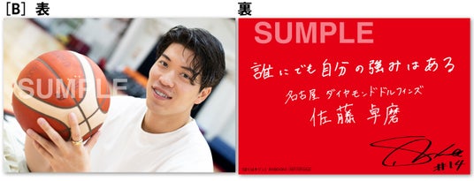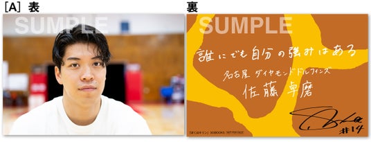 佐藤卓磨選手のスナップショットをポストカードにして配布! 裏面には直筆メッセージとサイン(印刷)があります。ドルフィンズアリーナ・名古屋ダイヤモンドドルフィンズ公式オンラインショップ限定版、 楽天ブックス限定版、通常版の3種があります。