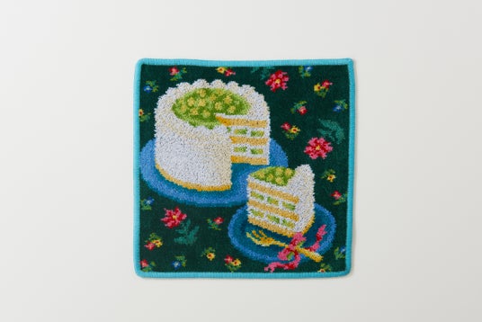 もう1つの柄は、自慢のスイーツが1枚のハンカチに大集合!ポイントのいちごやマカロンに加え、サクサクのパイ生地に挟んだバニラの香り高いカスタードクリームと、みずみずしいいちごを一緒に味わう見た目も華やかな『ナポレオンパイ』、14層にもなる濃厚なチョコレートケーキの『スーパーオペラレジェール』など、「パティスリーSATSUKI」で人気のラインアップをかわいく織り込んだ1枚に仕上げました。