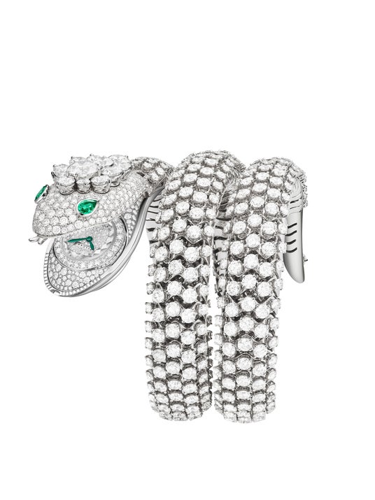 ハイジュエリーとハイエンドウォッチの素晴らしい融合と言えるこのシークレットウォッチは小型のピコリッシモキャリバーを備え、類まれなる芸術性と卓抜したクラフツマンシップが500時間も注ぎ込まれ製作されます。イエローゴールド、ピンクゴールド、ホワイトゴールドにダイヤモンドが瞬く「セルペンティ パリーニ」は、美しく輝く2つのペアシェイプカットのエメラルドが見る人を強く惹きつける魅力を放ち、時の経過を見つめながら自分らしく自由に生きる強さを刺激するのです。