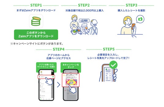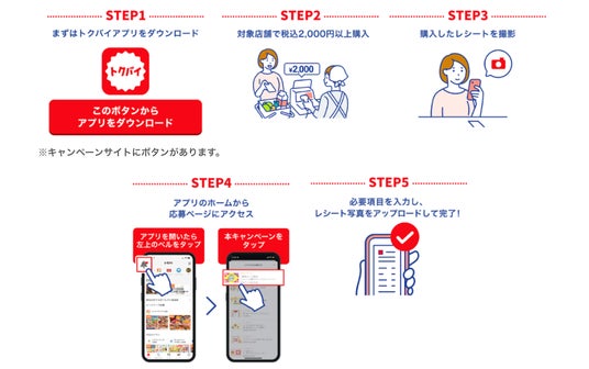 期間内に対象店舗で1回につき税込2,000円以上購入したレシートを使って、「トクバイ」アプリ、または「Zaim」アプリから応募(両方から応募も可能)