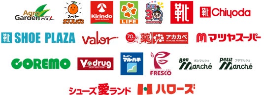 アグロガーデン、スーパーサンフレッシュ、キリン堂、ライフ、フレンテ、東京靴流通センター、靴チヨダ、シュープラザ、バロー、ドラッグストアアカカベ、マツヤスーパー、コレモ、V・ドラッグ、スーパーマルハチ、フレスコ、ボンマルシェ、プチマルシェ、シューズ愛ランド、ハローズ