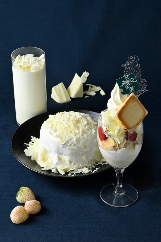 白い恋人ホワイトチョコレートパフェ 1,600円(税込) 「白い恋人」や「白いバウムTSUMUGI」、「白い恋人ホワイトチョコレートプリン」などISHIYAの人気商品を詰め込みました。