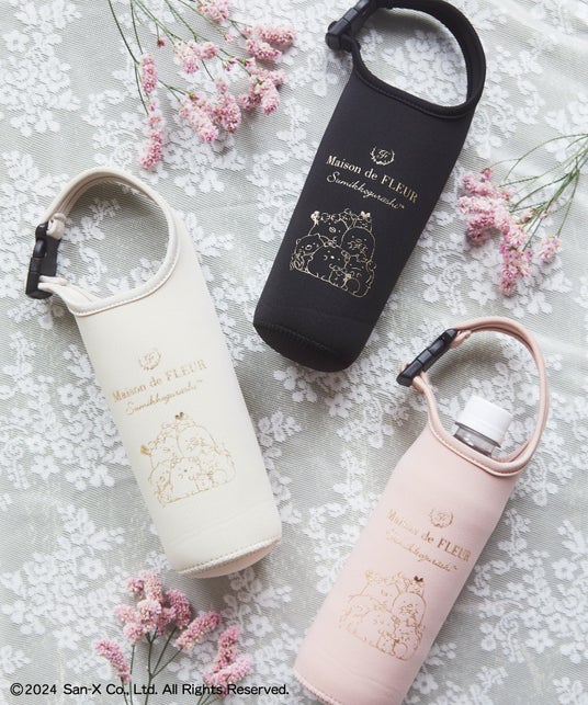 そのほか、背面の“すみっこ”にもイラストを配置してすみっコたちの気持ちを表現した「ラウンドポーチ」、キャラクターを箔プリントした便利な「ボトルケース」をラインアップいたしました。