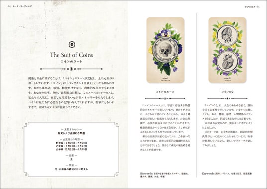 コインのスイート:健康とお金に関することは「コイン」のスイートが支配しています。仕事、身体、長期的な目標にフォーカスし、人生に安定した現実とつながるエネルギーをもらたします。