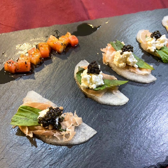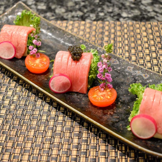 – 近江牛と中とろサラダ ジャパンキャビアと共に(近江牛のミスジとヒウチを炙り、中とろには贅沢にジャパンキャビアをマリアージュ。女性にも食べやすい一口サイズ。お酒にも合わせやすいサラダです。)