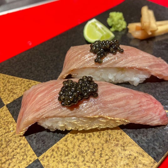 – 宮崎牛の炙り寿司に宮崎キャビア添え