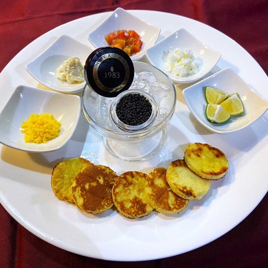 – 国産オシェトラキャビア『ジャパンキャビア オシェトラプレミアム』ブリニトーストとコンディマンとともに(クラシックスタイルでブリニトーストと薬味をそえてキャビアを味わっていただく料理です。アラカルトメニューとしてキャンペーン期間内特別価格で販売します。)
