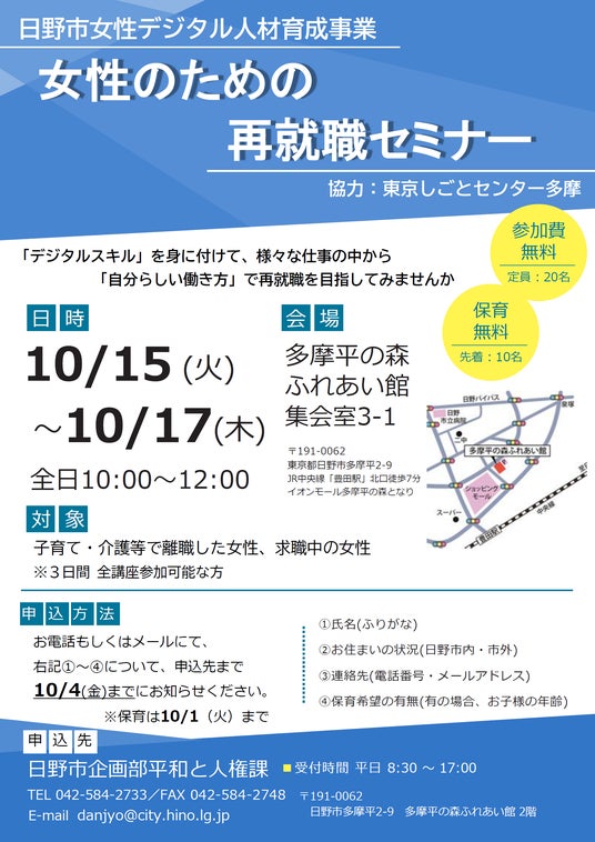 10月15日(火)から3日間、日野市立多摩平の森ふれあい館にて、日野市女性デジタル人材育成講座「女性のための再就職セミナー」を開催いたします。「デジタルスキル」を身に付けて、様々な仕事の中から「自分らしい働き方」で再就職を目指してみませんか。