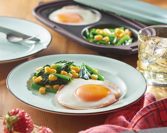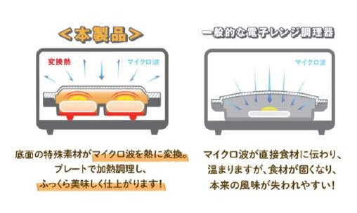底面の特殊素材が電子レンジのマイクロ波を熱に変換。食材本来の風味を失わず、グリルのような香ばしい焼き目がついて、朝食に欠かせない目玉焼きもふっくらとおいしく仕上がります。