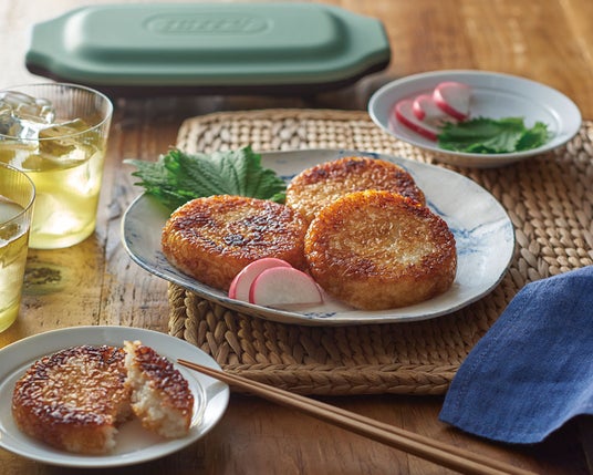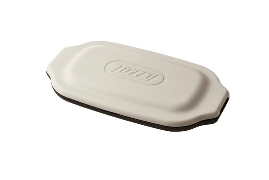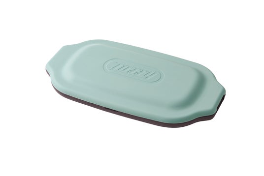 本体底面の特殊素材が電子レンジのマイクロ波を熱に変換し、プレートで加熱調理することで火を使わなくても焼き目がついた本格的な料理が完成します。プレートには日本メーカー製のふっ素樹脂加工を施し、お手入れも簡単。カラーはToffyシリーズで人気の「ペールアクア」「グレージュ」の2色展開。そのまま食卓にも置くことができ、淡い色合いがテーブルを彩ります。