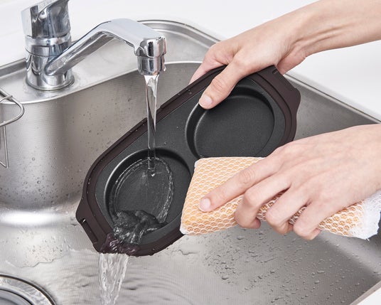 日本メーカー製のふっ素樹脂加工で汚れを落としやすく、お手入れも簡単。プレートに食材がこびり付きにくいので、スルンときれいに取り出せます。