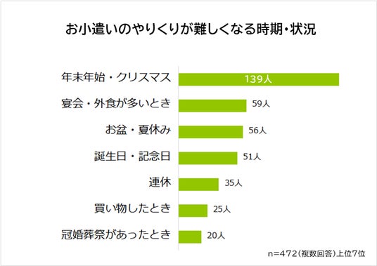 「お小遣いのやりくりが難しくなる時期・状況」の圧倒的1位は「年末年始・クリスマス(139人)」でした。2位「宴会・外食が多いとき(59人)」、3位「お盆・夏休み(56人)」が続きます。「1年のうちでいつ?」と聞かれたら、「長期休暇中」「大型連休」と答える人が多いとわかります。