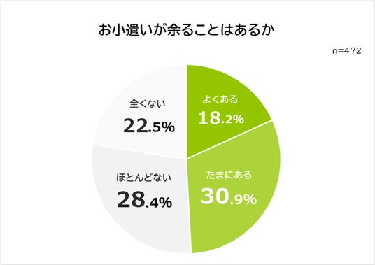 「お小遣いが余ることはありますか」という質問には、「よくある」「たまにある」と答えた人が合わせて49.1%で、半数近くとなっています。そもそも月々の出費が30,000円以内に収まるので、お小遣いの額を20,000円や30,000円に設定している人も多いのでしょう。