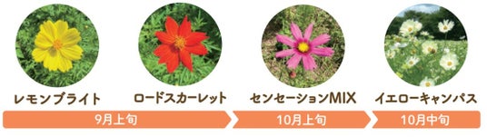 主な品種など:コスモスの各品種が順次開花する「開花リレー」形式で見頃を迎えます。ピンクや白の花色が秋らしいコスモスの花畑は、10月上旬頃が最盛期となる見込みです。