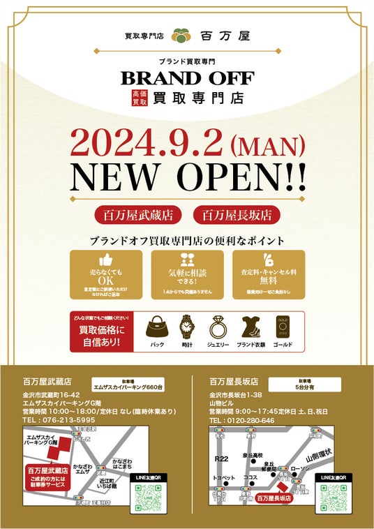 中古ブランド品のバッグ・時計・宝飾品などを扱うブランドリユースシェアNo.1(※)のコメ兵ホールディングスグループの一翼である株式会社K-ブランドオフ(石川県金沢市)は、石川県金沢市にFC39、40店舗目となる「ブランド買取専門店 BRAND OFF 百万屋長坂店」と「ブランド買取専門店 BRAND OFF 百万屋武蔵店」をオープンいたします。 ※ 「リユース市場データブック2023」((株)リフォーム産業新聞社調べ)