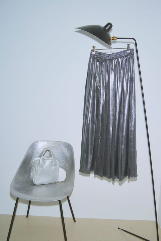 大人でも取り入れやすいダークシルバーのメタリックスカートは、程よい光沢感で都会的かつスタイリッシュに。