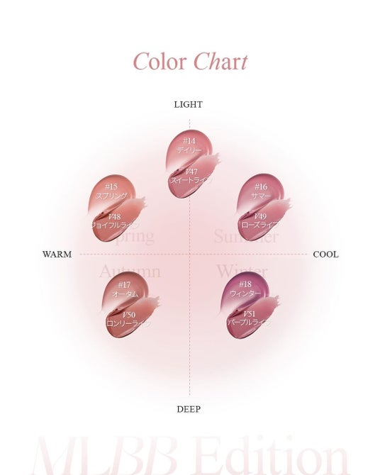 新商品「MLBBエディション」は、従来のピアーの代表リップ商品であるラストベルベットティント、グローリップティントに新たに10色が追加されました。 トレンディなソフトカラー感をもとに、ニュートラルからイエベ春、ブルベ夏、イエベ秋、ブルベ冬の各パーソナルトーンに合わせたカラーとして開発されました。