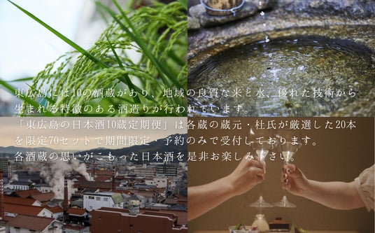東広島市は市内に10の酒蔵があり、地域の良質な米と水、優れた技術から生まれる特徴のある酒造りが行われています。東広島市内にある10の蔵元の「日本酒を通じ全国の皆さまと繋がり、絆を作りたい」という思いを伝えるため、蔵元・杜氏が厳選したふるさと納税返礼品「東広島の日本酒10蔵定期便」を提供します。昨年度からラインアップを一部変更し、限定70セットで、期間限定・予約のみの受付となります。