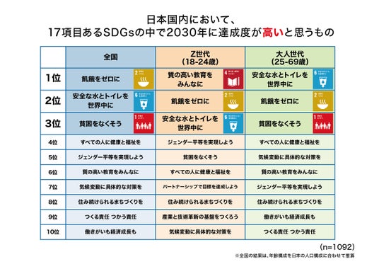 ・ SDGsの目標のうち2030年において達成度が高いと思うものは、1位「飢餓をゼロに」、2位「安全な水とトイレを世界中に」、3位「貧困をなくそう」となりました。