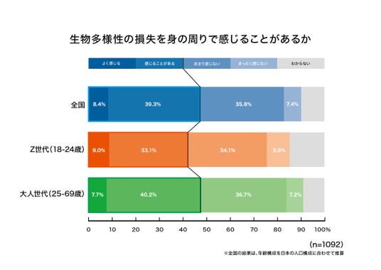 ◆「気候変動」と並び大きな課題となっている「生物多様性の損失」について、全国平均で47.7%が「身の回りで感じる」。大人世代の方がZ世代より関心がやや高い。