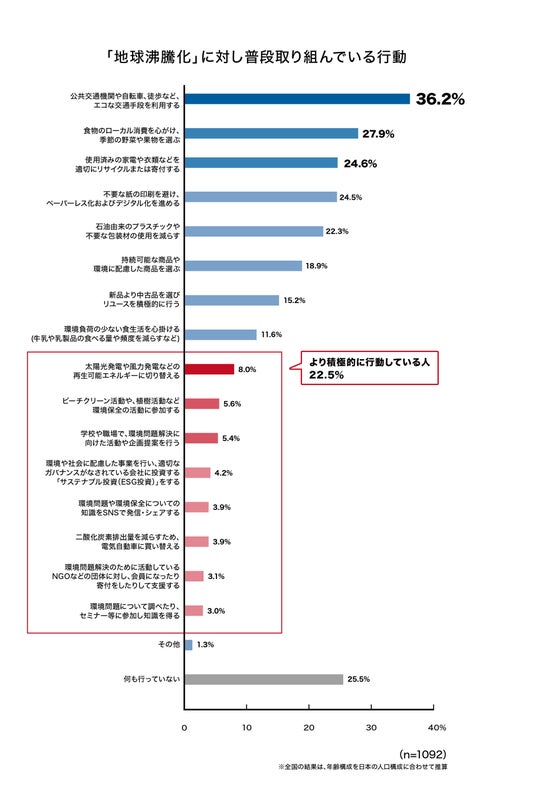 ・ より積極的な行動と考えられる「太陽光発電や風力発電などの再生可能エネルギーに切り替える」「ビーチクリーン活動や、植樹活動など環境保全の活動に参加する」などの取り組みについて、そのうち一つでも選択した人は22.5%でした。