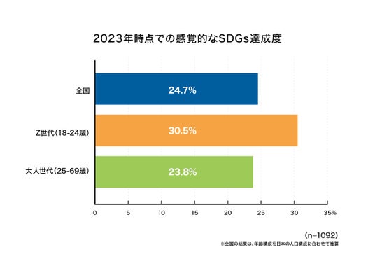 ◆2023年時点の感覚的なSDGs達成度は、全国平均24.7%。Z世代30.5%で、大人世代23.8%よりやや高い。