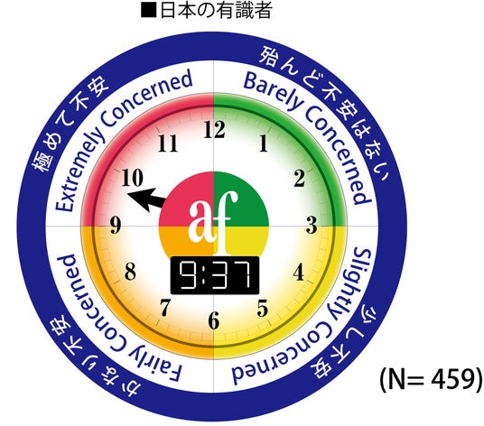 日本の有識者の回答「9時37分」の「極めて不安」とは2時間強の差はあるが、いずれも危機意識は高い。
