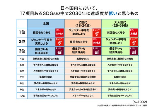 ・ Z世代・大人世代ともに、順序の差はあるものの上位3位は同じ項目となりましたが、Z世代の1位が昨年に引き続き「ジェンダー平等を実現しよう」となり、昨今社会課題となっている性差別に対して問題解決を悲観している傾向がみられました。