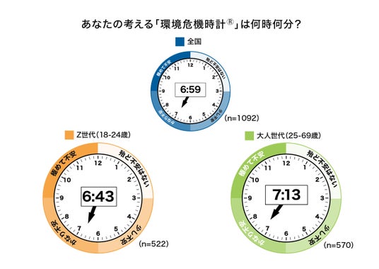 ・ 環境問題への危機意識を時刻に例えると、全国平均で「6時59分」となり、「かなり不安」という結果になりました。世代別では、Z世代は「6時43分」、大人世代は「7時13分」で大人世代の方がより危機を感じているものの、いずれも「かなり不安」という結果でした。
