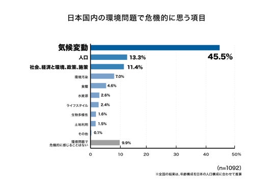 ・ 日本国内における環境問題において、危機的な状態にあると考える項目として最も多かったのは、1位「気候変動」(45.5%)で、2020年から毎年実施している本調査において、5年連続で1位となりました。その理由として、線状降水帯などの豪雨や長期化する猛暑、それによる農作物への影響で食糧難を懸念する回答が寄せられました。