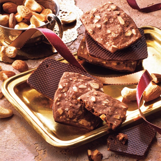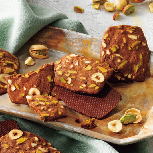 ヘーゼルナッツとピスタチオを入れて、薄く焼き上げたココア生地の片面に、すっきりとした甘さのチョコレートをコーティング。生地にはアクセントに塩と風味付けのコニャックを練り込みました。香り高いヘーゼルナッツと旨み豊かなピスタチオを組み合わせることで、風味と食感に奥行きを持たせた、さっくりとした軽い食感の薄焼きサブレです。