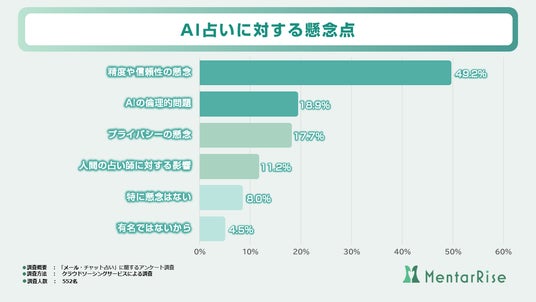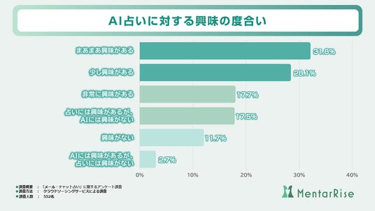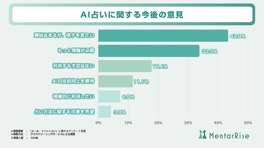 半面、「占いに興味があるが、AIには興味がない」と回答したユーザーは、17.5%と少数派ではあるものの、血の通った人間の占い師へ予言やアドバイスへの根強い人気もあるようです。
