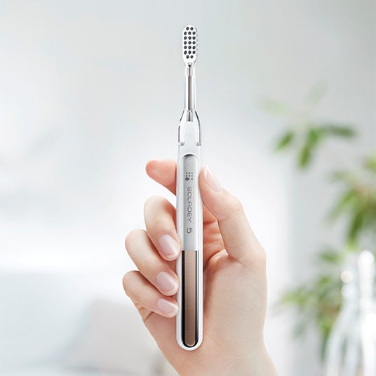 歯磨き剤を使わずに磨ける歯ブラシ。光触媒を応用し、水だけのブラッシングで歯の汚れを落とせます。水と光に反応した酸化チタン(ブラシ部の黒い棒)から電子が発生し、その電子によって歯の汚れを浮かせて、水だけのブラッシングで汚れを落とせます。