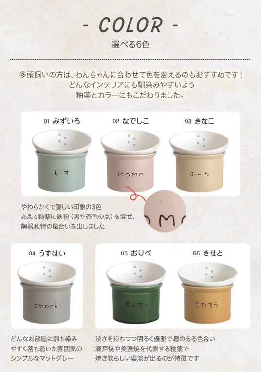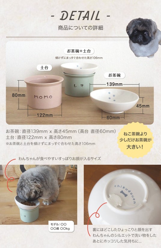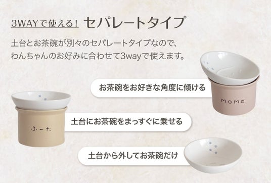 お茶碗と土台が分かれるセパレートタイプのフードボウルなのでわんちゃんに合わせた好みの角度でご飯を食べることが可能。使用後の洗い物のわずらわしさも軽減されるので飼い主さんにも優しいデザインとなっています。大切なわんちゃんのお名前も入れることが出来る世界で1つの器です。