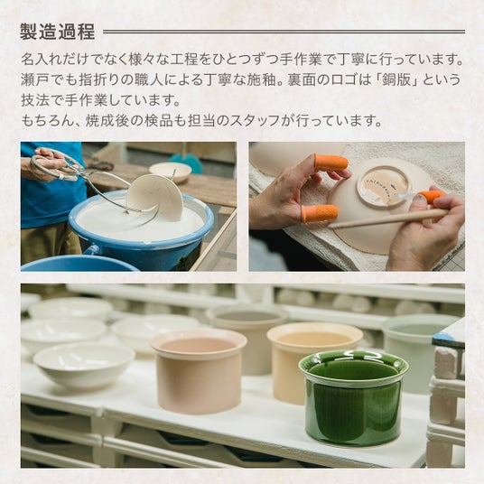 かたむけてシリーズの絵付けは“銅版”という技法で行っています。ガラス質の釉薬の施釉も熟練の職人が行っています。大きな窯での焼成ですが焼き上がり後も担当者がひとつひとつ丁寧に検品しております。
