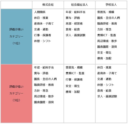 本調査では、全口コミの中から30代の保育士が投稿した口コミだけを調査対象とし、20個の口コミカテゴリーごとに、保育園・幼稚園を運営する「株式会社」「社会福祉法人」「学校法人」の評価点数を比較しています。そして、「1位(青色)」「2位(黄色)」「3位(赤色)」の色付けを行い、それぞれの職場の強み・弱みといった特徴を整理しています。(参考情報として公立の保育園・幼稚園を運営する「自治体」も公開)