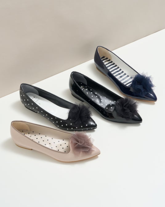 メッシュ素材のコサージュがフェミニンな一足。ドットやストライプのインソールもポイント。