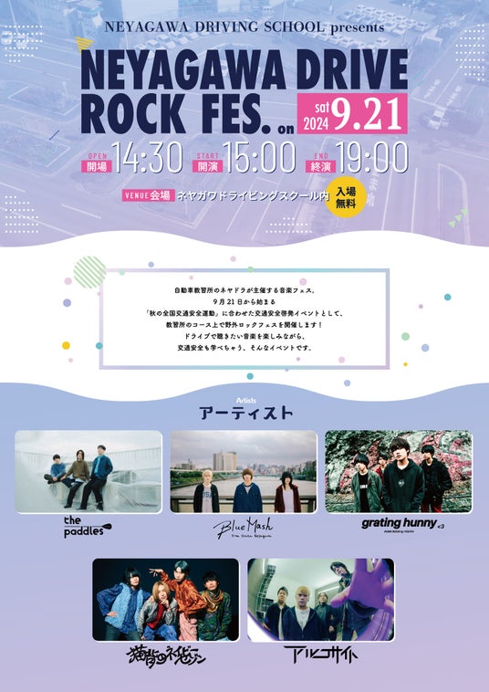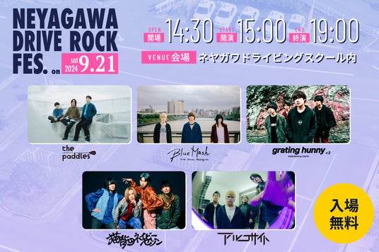 「卒業したくない教習所」をコンセプトに教習所らしからぬ様々な取り組みを行う「ネヤガワドライビングスクール」(通称「ネヤドラ」。大阪府寝屋川市)は、2024年9月21日(土)に教習所内で野外音楽フェス「NEYAGAWA DRIVE ROCK FES.」(寝屋川ドライブロックフェス)を開催いたします。